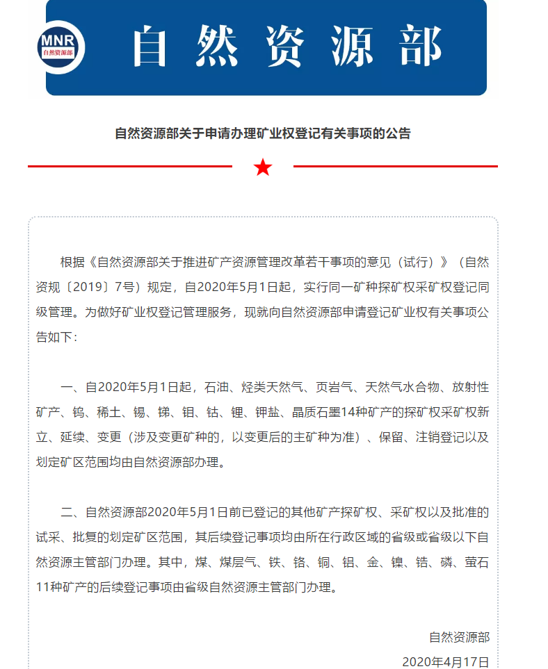 自然資源部關(guān)于申請(qǐng)辦理礦業(yè)權(quán)登記有關(guān)事項(xiàng)的公告
