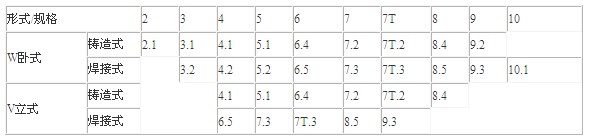 我公司雙螺桿泵分立式、臥式兩大類,規(guī)格有2,3,4,5,6,7,7T,8,9,10共10個(gè),其品種與規(guī)格的型號(hào)組合見(jiàn)下表: